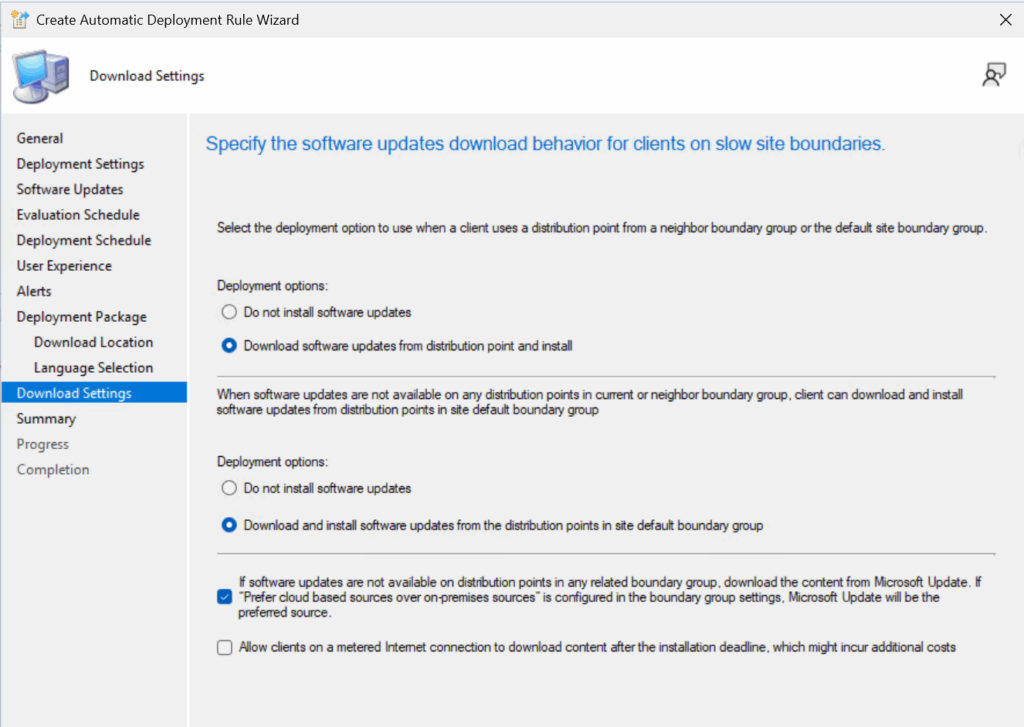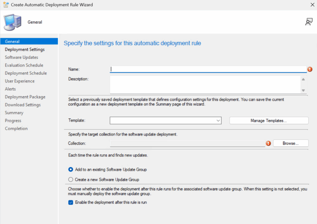 - tworzy wdrożenie na wskazaną kolekcję utworzonej wcześniej Software Update Group
