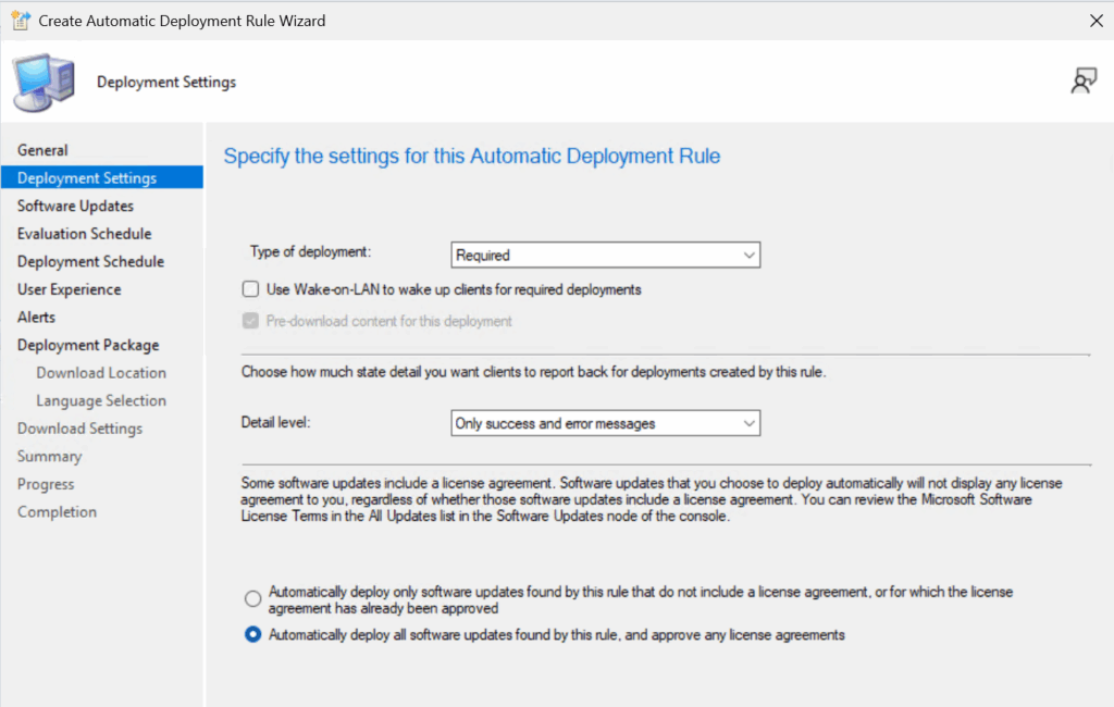 Niektóre aktualizacje wymagają akceptacji postanowień licencyjnych. Tworząc regułę automatycznego wdrażania należy zaznaczyć opcje Automatically deploy all software updates found by this rule, and approve any license agreements. Dzięki temu aktualizacje wymagające akceptacji postanowień licencji będą mogły być wdrażane razem z innymi.