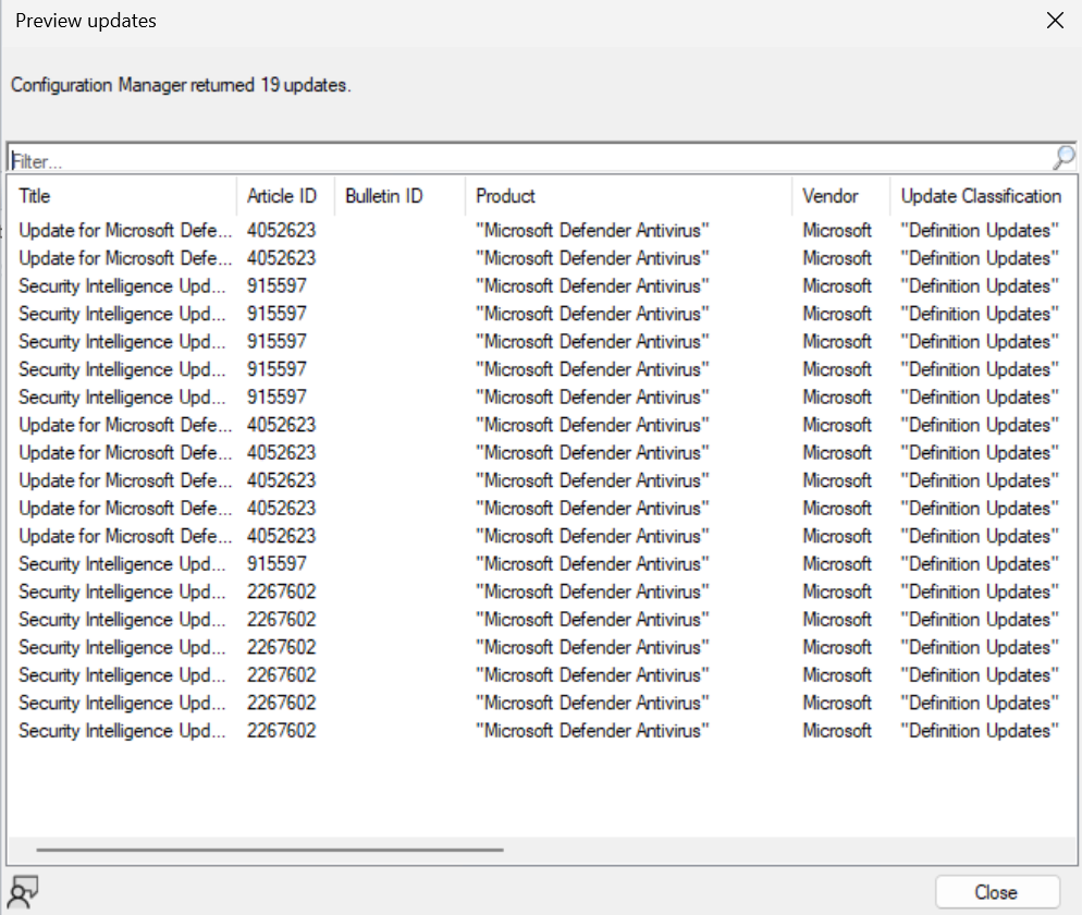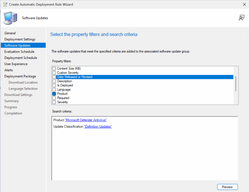 Kolejnym krokiem jest ustawienie kryteriów jakie muszą spełnić aktualizacje, które będą wdrażane przez tą regułę. Możemy np. wybrać filter Product, a następnie Microsoft Defender Antywirus. I dodać do tego klasyfikacje aktualizacji jako Defintion Updates. W celu potwierdzenia że nasz reguła będzie coś wdrażać należy skorzystać z opcji Preview.