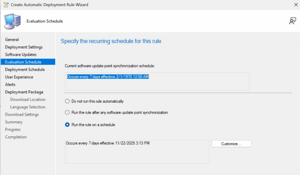 Kolejnym krokiem jest ustawienie harmonogramu wykonywania przez serwer reguły. Wybieramy pomiędzy ręcznym uruchamianiem, lub automatycznym. Najlepsze ustawienie to Run the rule after any update poin synchronization. Regułabędzie wtedy uruchamiana każdorazowo po synchronizacji danych z serwera WSUS przez serwer ConfigMgr.