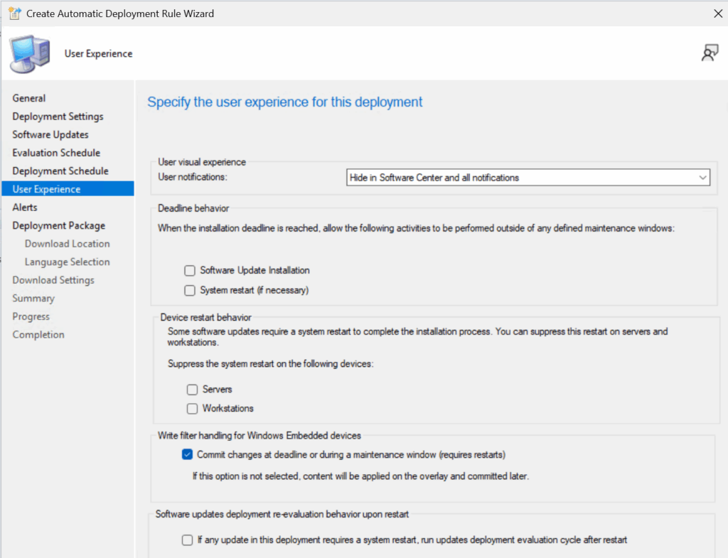 Pozostałe opcje zależą od typu wdrożenia jakie wybraliśmy na początku. W przypadku wdrożenia typu Required trzeba ustawić datę Installation deadline – kiedy te aktualizacje zainstalują się automatycznie.