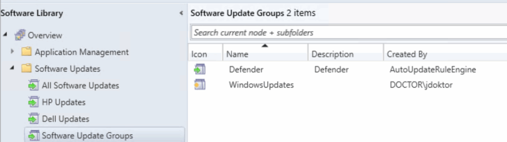 Utworzoną przez regułę Software Update Group możemy obejrzeć na zakładce Software Library\Overview\Software Updates\Software Updates Groups.
