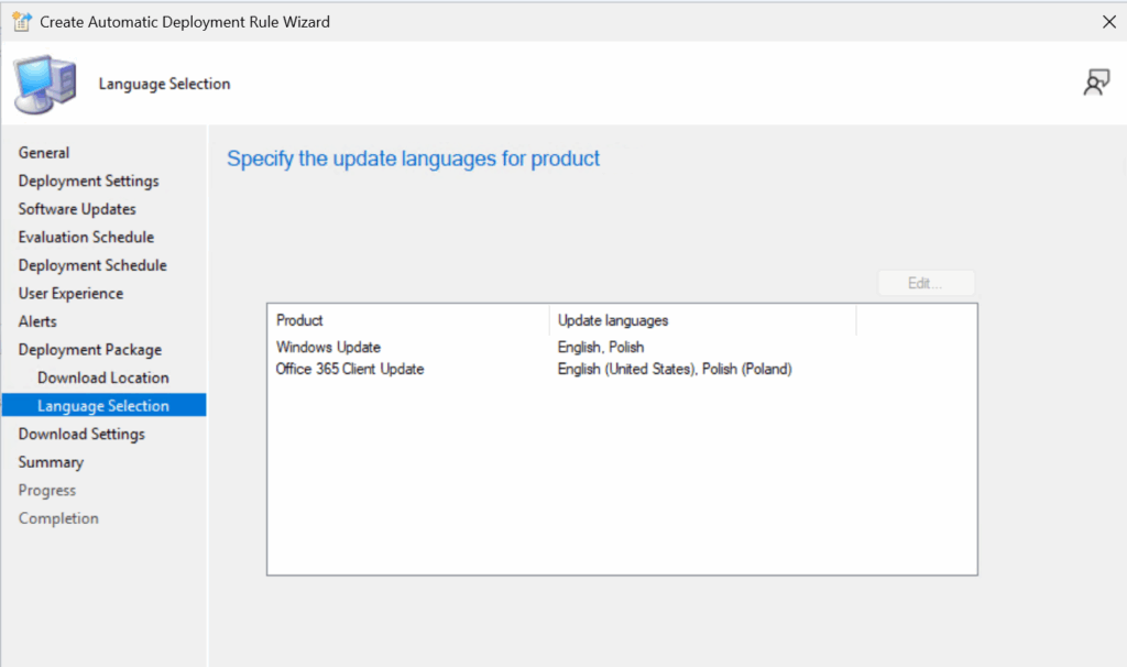 Końcowym etapem konfiguracji reguły jest wskazanie jakie wersje językowe aktualizacji nas interesują. Trzeba pamiętać, że każda wersja językowa to oddzielny plik wykonywalny.