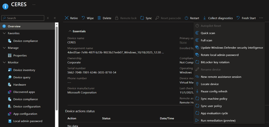 W przypadku urządzeń pracującym w trybie co-management oprócz akcji związanych z usługą Intune mamy do dyspozycji trzy wyżej wymieniona akcje klienta serwera ConfigMgr.