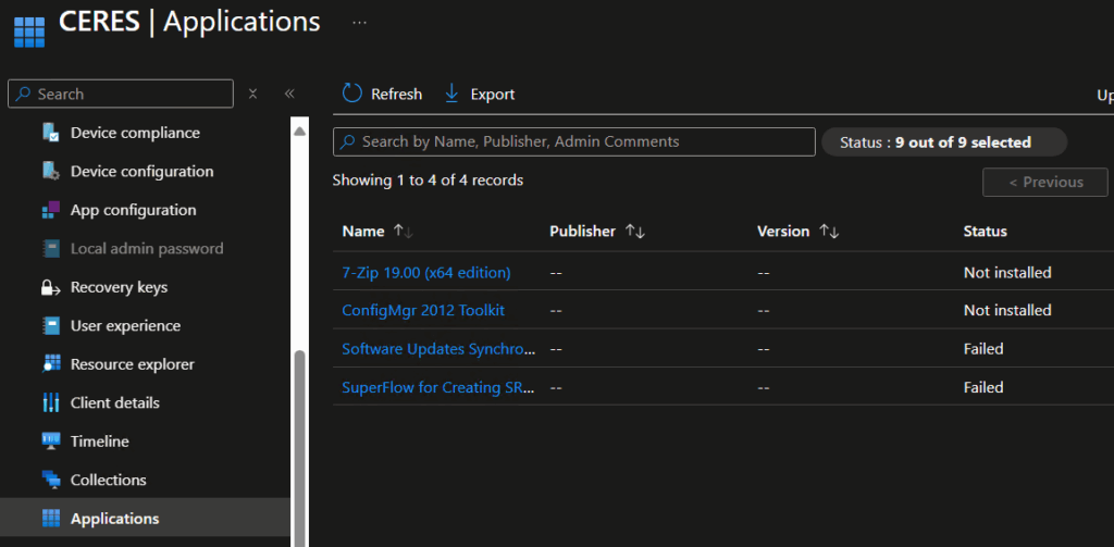 Dodatkowo na konsoli Intune pojawia się dodatkowe akcje związane z informacjami o zarządzanej stacji. Możemy np. pobrać listę zainstalowanych aktualizacji, listę dostępnych do instalacji aplikacji. W tym trybie opcję dostępne na konsoli Intune są takie same dla stacji roboczych jak i serwerów.