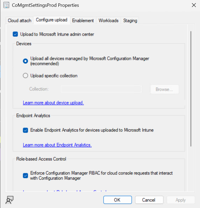 - Configure upload – tutaj decydujmy czy urządzenia z zainstalowanym klientem serwera ConfigMgr pojawia się na konsoli Intune