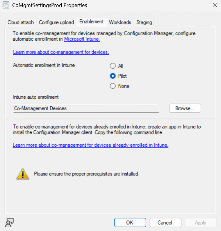 Zakładka Enablement służy do konfiguracji automatycznej instalacji klienta Intune na urządzeniach zarządzanych przez serwer ConfigMgr wraz z włączeniem co-management.