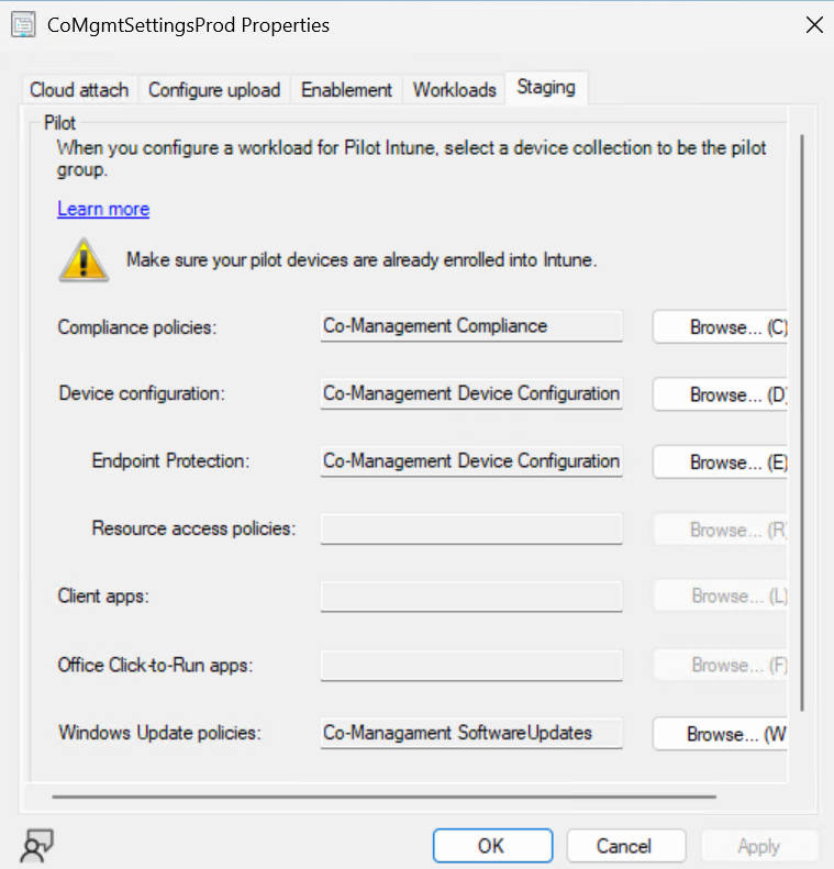 Zakładka Staging służy do wskazania kolekcji serwera ConfigMgr dla których serwer przypisze odpowiednie polisy z ustawieniami co-management.