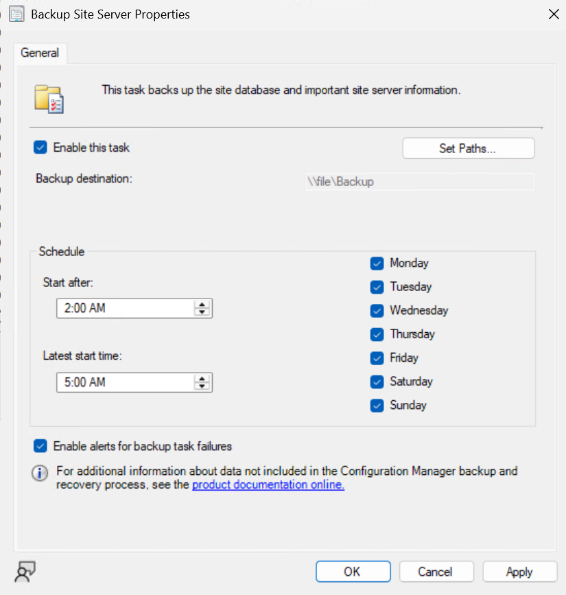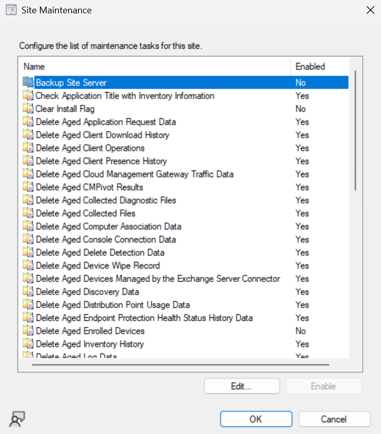 Po instalacji systemu niektóre z zadań nie są wyłączone, a niektóre włączone z domyślnymi ustawieniami. Domyślnie, podczas instalacji ConfigMgr ,zadanie Backup ConfigMgr Site Server nie jest włączone. Jego konfiguracja to pierwsze zadanie, jakie powinniśmy wykonać natychmiast po instalacji ConfigMgr.