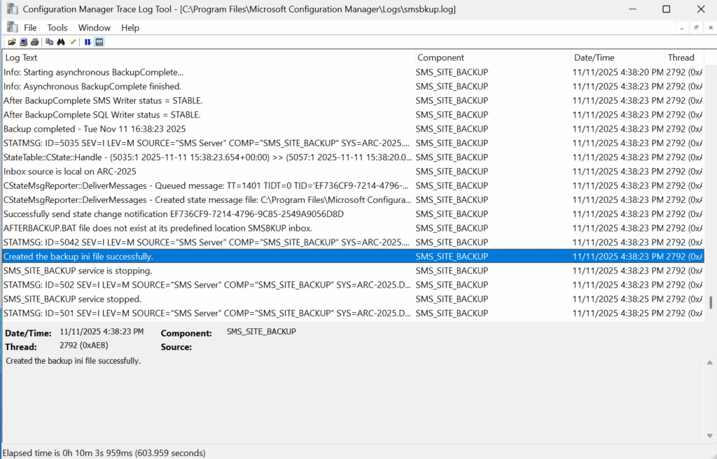 - Wykonywana jest kopia zapasowa bazy danych ConfigMgr.